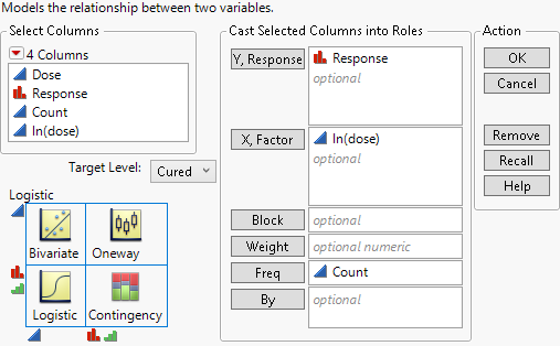 Note: You can also launch a logistic analysis from the JMP Starter window. Select View > JMP Starter > Basic > Logistic.