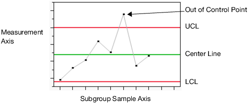 • The two red lines are the upper and lower control limits, labeled UCL and LCL. These limits give the range of variation to be expected in the summary statistic when the process is in statistical control. If the process is exhibiting only routine variation, then all the points should fall randomly in that range. In Figure 12.7, one measurement is above the upper control limit. This is evidence that the measurement could have been influenced by a special cause, or is possibly a defect.
