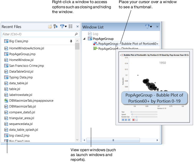 The JMP Home Window provides instant access to open window and files. Opening recently opened files, closing windows, and pinning frequently used files are a few of the options.