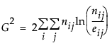 The Likelihood Ratio Chi-square test statistic is computed as twice the negative log-likelihood for Model in the Tests table. Some books use the notation G2 for this statistic. The difference of two negative log-likelihoods, one with whole-population response probabilities and one with each-population response rates, is written as follows: