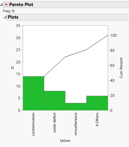 This example uses the Failure.jmp sample data table, which contains failure data and a frequency column. It lists causes of failure during the fabrication of integrated circuits and the number of times each type of defect occurred. A threshold value of 2 is specified for this example.
