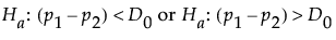 where p1 and p2 are the population proportions from two populations, and D0 is the hypothesized difference in proportions.