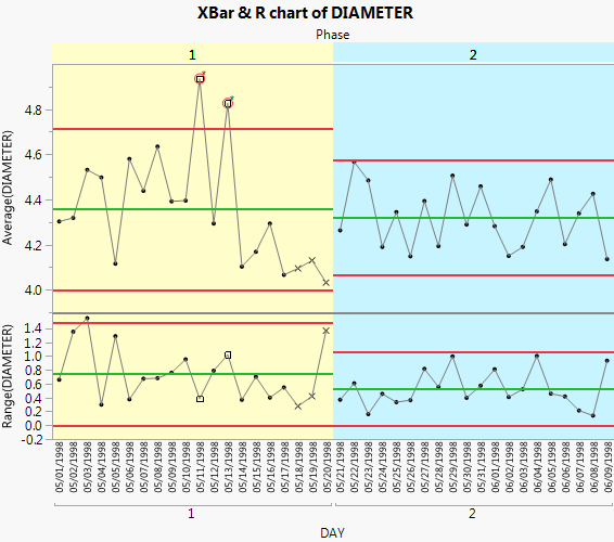 A manufacturer of medical tubing collected tube diameter data for a new prototype. The data was collected over the past 40 days of production. After the first 20 days (phase 1), some adjustments were made to the manufacturing equipment. Analyze the data to determine whether the past 20 days (phase 2) of production are in a state of control.