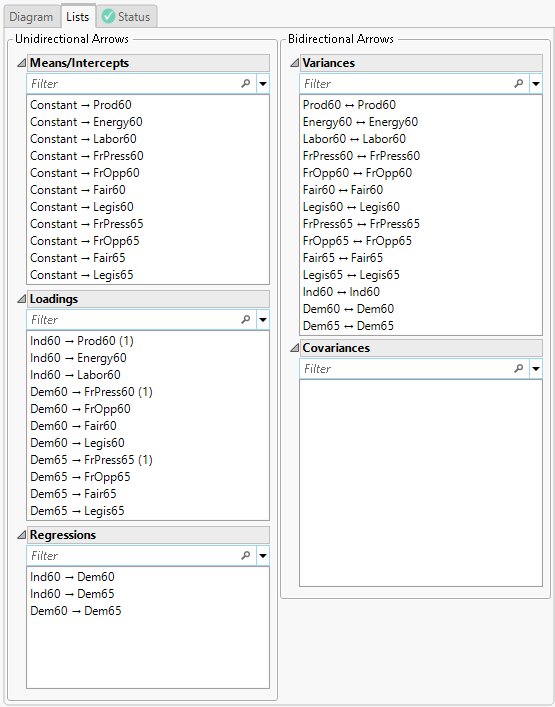 Additional Example of Structural Equation ModelsIn this example, you are building the structural equation model for industrialization and political democracy described in Bollen (1989), which uses data from 75 developing countries. The variables in the data table include four measures of democracy in 1960 and 1965, and three measures of industrialization in 1960. These variables are described in the Notes column property in each column of the data table. To view the Notes column property, right-click a column name, select Column Info, and select Notes under Column Properties. The type of structural equation model you are building is a structural regression model.