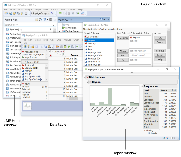 Figure 2.2 Anatomy of a Typical JMP Session on Windows