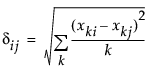 When the data is an attributes list, it is converted to a distance matrix and then MDS is applied. The distance matrix is calculated using Euclidean distance. For each pair of items define the distance between the items by: