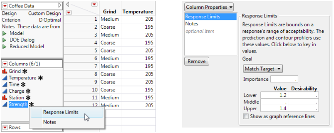 Some of the column properties described in this appendix are useful in general modeling situations. To use the properties more generally, you can specify them yourself. This ability is particularly useful when your design has not been created by a DOE platform. Some of the examples in this appendix illustrate situations where you add a column property on your own.