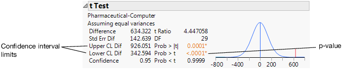 Use the confidence interval limits to determine how much difference exists in the profits of both types of companies. Look at the Upper CL Dif and Lower CL Dif values in Figure 5.18. The financial analyst concludes that the average profit of pharmaceutical companies is between $343 million and $926 million higher than the average profit of computer companies.