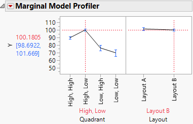 2. In the Profiler plot, compare the predicted values for Y across the quadrants by first setting the vertical red dotted line at Layout A and then at Layout B.