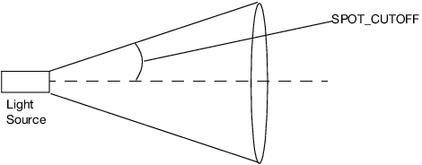 To create a spotlight, limit the shape of the light to a cone. Use the SPOT_CUTOFF argument to define the side of the cone, as shown in the following illustration.