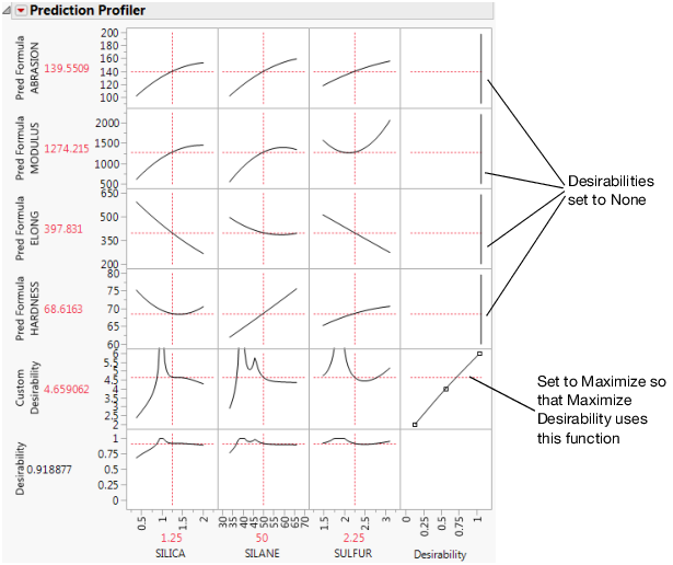 First, create a column called Custom Desirability that contains the above formula. Then, select Graph > Profiler to launch the platform. Select all the Pred Formula columns and the Custom Desirability column and select Y, Prediction Formula. Check the Expand Intermediate Formula option. Turn on the desirability functions by selecting Optimization and Desirability > Desirability Functions from the red triangle menu. All the desirability functions for the individual effects must be turned off. To do this, first double-click in a desirability plot window, and then select None in the window that appears. Set the desirability for Custom Desirability to be maximized.