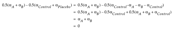 • the mean response for treatments A and B combined to the mean response for the combined control and placebo groups.