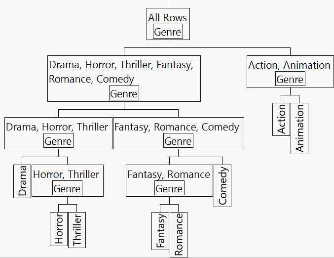 Among all the splits of the levels of Drama, Horror, Thriller, Fantasy, Romance, and Comedy (A1) and of the levels of Action and Animation (A2), the algorithm determines that this split has the largest sum of squares between groups.