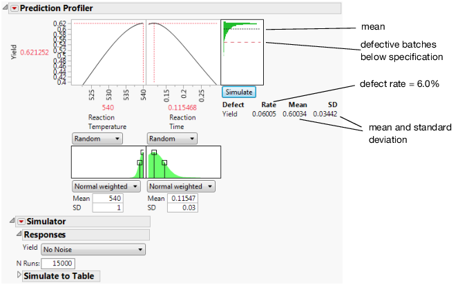 The predicted Yield is 0.62 for Reaction Temperature of 540 and Reaction Time of 0.115. The simulation estimates an average defect rate of about 6% with a standard deviation of 0.03 given the assumed variation in the temperature and time. The defect rate of 6.0%, indicates that about 6.0% of batches would be out of specification.
