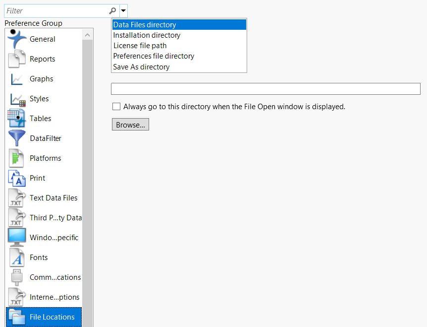 Data Files directory | Change the folder in which JMP looks for data files (for example, data tables). |