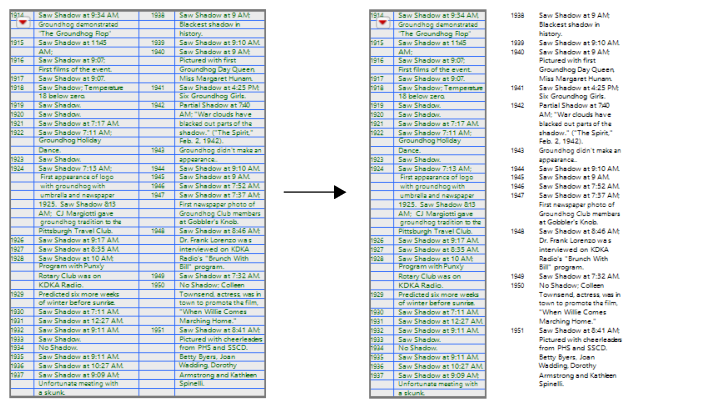 Note: Groundhog Day Predictions.pdf in the Samples/Import Data folder shows a cleaned-up version of the data that is auto-detected in the PDF Import Wizard.
