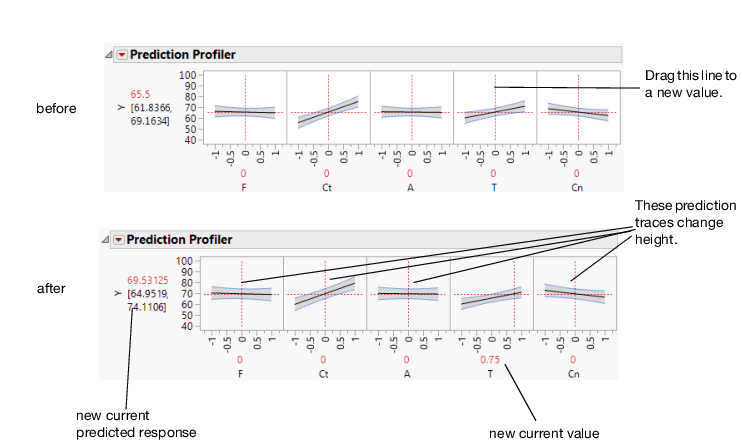 • If you change the value of a factor, the prediction trace for that factor is not affected, but the prediction traces of all the other factors can change. The Y response line must cross the intersection points of the prediction traces with their current value lines.