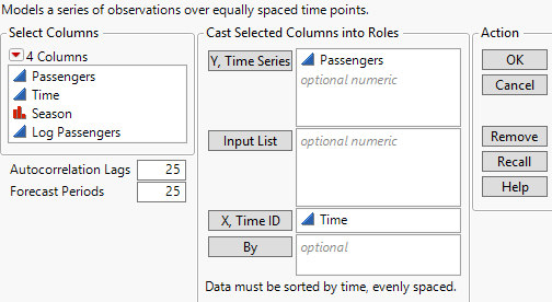 Caution: It is assumed that the observations of the variable assigned to X, Time ID are equally spaced. However, the Time Series platform checks only whether the time stamps are increasing. The platform does not check if the observations are equally spaced.