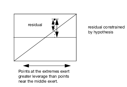 Figure 3.56 shows how residuals are depicted in the leverage plot. The distance from a point to the line of fit is the residual for a model that includes the effect. The distance from the point to the horizontal line is what the residual error would be without the effect in the model. In other words, the mean line in the leverage plot represents the model where the hypothesized value of the parameter (effect) is constrained to zero.