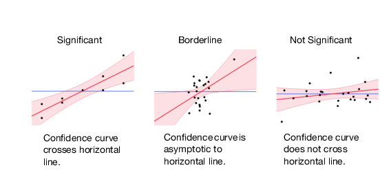 Confidence curves for the line of fit are shown on leverage plots. These curves provide a visual indication of whether the test of interest is significant at the 5% level (or at the Set Alpha Level that you specified in the Fit Model launch window). If the confidence region between the curves contains the horizontal line representing the hypothesis, then the effect is not significant. If the curves cross the line, the effect is significant. See the examples in Figure 3.57.