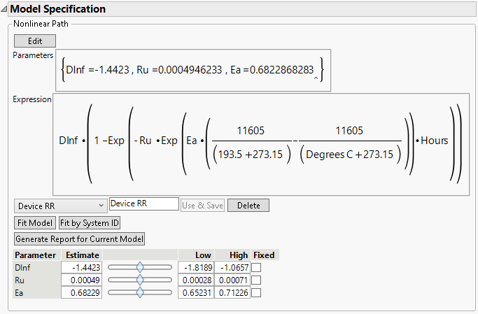 Once the formula is created in the data table, click the Degradation Data Analysis red triangle and select Redo > Redo Analysis. Then, return to the column selection shown in Figure 7.10. Select the column that contains the model, and then click OK. You are returned to the Nonlinear Path Model Specification. For more information about all the features for that specification, see Model Specification Details.