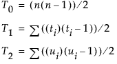 The ti (the ui) are the number of tied x (respectively y) values in the ith group of tied x (respectively y) values.