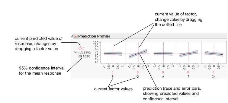 • The black lines within the plots show how the predicted value changes when you change the current value of an individual X variable. The 95% confidence interval for the predicted values is shown by a dotted curve surrounding the prediction trace (for continuous variables) or an error bar (for categorical variables).
