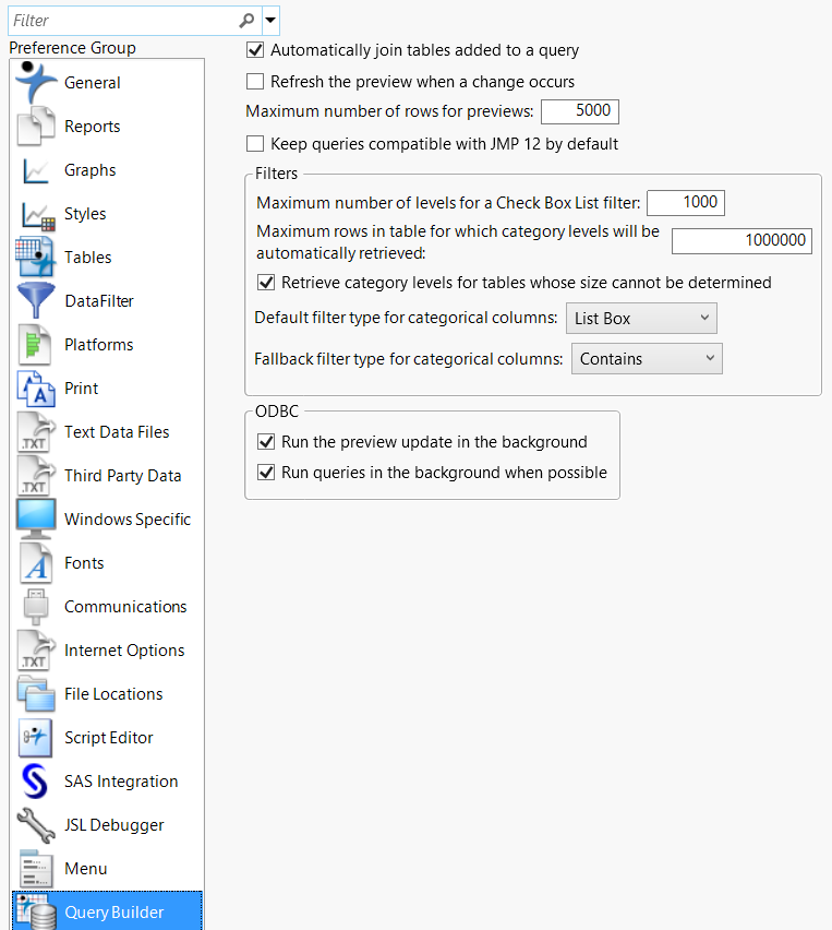 Keep queries compatible with JMP 12 by default | Maintains query compatibility with JMP 12. When you open a query that is marked JMP 12 compatible in JMP 13 or later, features that create compatibility problems are hidden regardless of how the preference is set. |