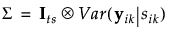 Denote the block diagonal component of the covariance matrix Σ corresponding to the ikth subject within treatment by Σik. In other words, Σik = Var(yik|sik). Because observations over time within a subject are not typically independent, it is necessary to estimate the variance of yijk|sik. Failure to account for the correlation leads to distorted inference.