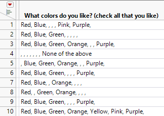 Tip: Use the Multiple Responses column property for columns that contain delineated multiple responses. See Properties That Control How Columns Are Used in Platforms in Using JMP.