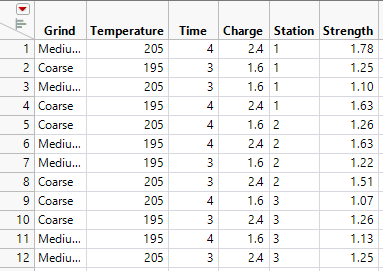 Your design and the experimental results for Strength are given in the Coffee Data.jmp sample data table (Figure 3.11), located in the Design Experiment folder.