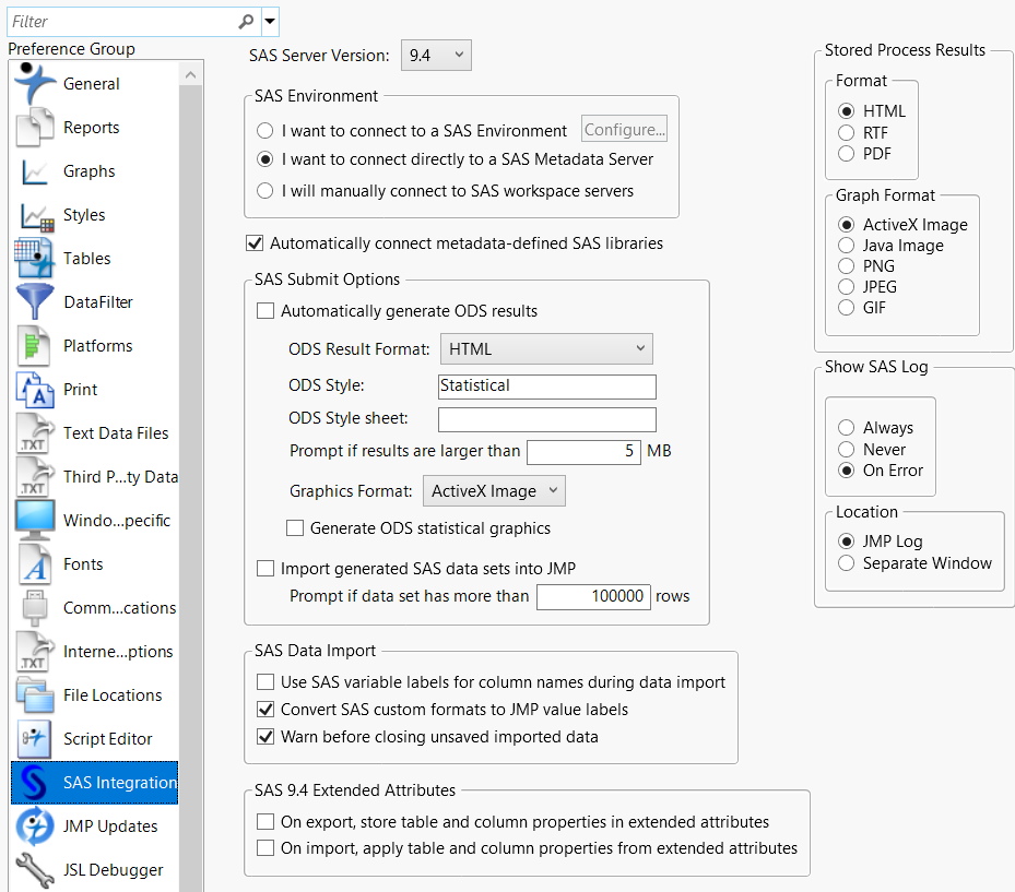 Automatically connect metadata-defined SAS libraries | Select this option to connect to metadata-defined SAS libraries automatically across all JMP sessions when you connect to a SAS Workspace Server. Selected by default. When the Workspace Server contains a large number of metadata-defined SAS libraries, deselect this option to speed up your connection to the server. |