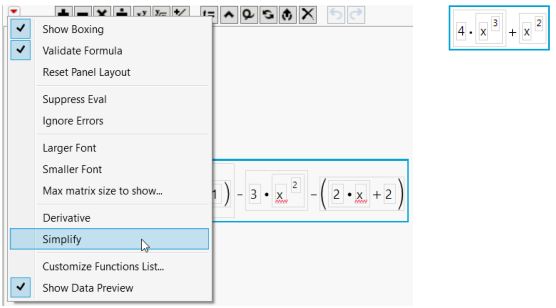 Figure 7.16 Selecting Simplify (Left) Produces a Simplified Formula (Right)