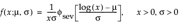 With these parameters, the pdf and the cdf of the Weibull distribution are expressed as a log-transformed smallest extreme value distribution (SEV) using a location-scale parameterization with μ = log(α) and σ = 1/β: