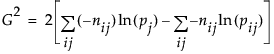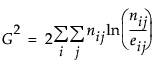 The Likelihood Ratio Chi-square test statistic is computed as twice the negative log-likelihood for Model in the Tests table. Some books use the notation G2 for this statistic. The difference of two negative log-likelihoods, one with whole-population response probabilities and one with each-population response rates, is written as follows:
