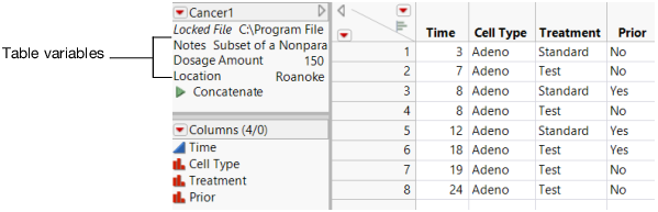 A table variable can contain textual information (for example, source information for the data), or a value that can be used by column formulas or JSL scripts. Table variable names appear in the table panel at the left of the data grid.