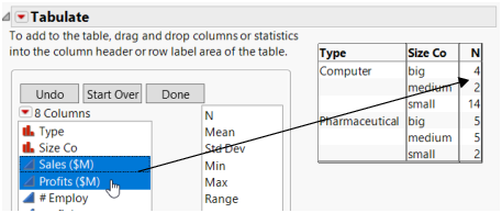 Use the Tabulate command to drag columns into a workspace, creating summary statistics for each combination of grouping variables. This example shows you how to use Tabulate to create the same summary information that you just created using Summary.
