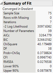 The chi-square statistic for this model, which is listed in the Summary of Fit report, is 40.18 with 38 degrees of freedom. Note that the corresponding p-value is 0.3739, which is not significant. This indicates that there is not evidence to reject the null hypothesis that the model fits well. Therefore, you conclude that this model fits the data reasonably well.