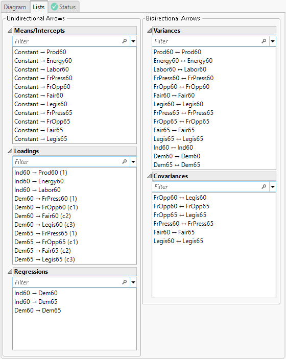 Additional Example of Structural Equation ModelsIn this example, you are building the structural equation model for industrialization and political democracy described in Bollen (1989), which uses data from 75 developing countries. The variables in the data table include four measures of democracy in 1960 and 1965, and three measures of industrialization in 1960. These variables are described in the Notes column property in each column of the data table. To view the Notes column property, right-click a column name, select Column Info, and select Notes under Column Properties. The type of structural equation model you are building is a structural regression model.