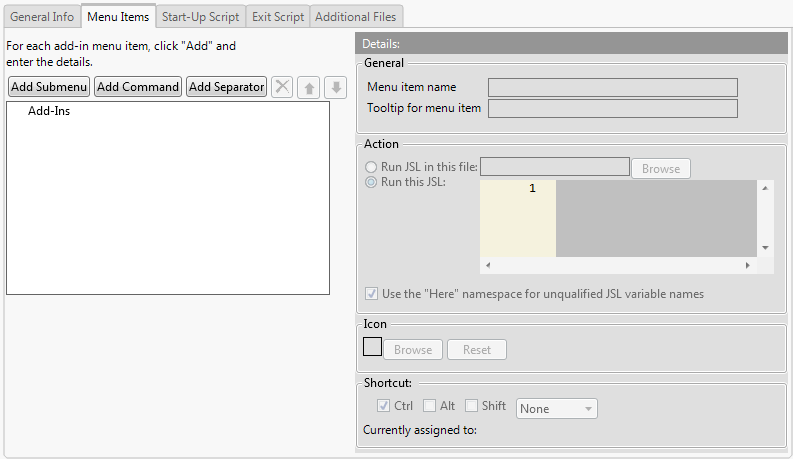 Click the Start-Up Script tab to add a script that runs when JMP starts up (and the add-in starts). You can select an existing script (Run JSL in this file) or copy and paste in a script (Run this JSL). For example, you could provide a message telling the user that the add-in is installed upon start-up.