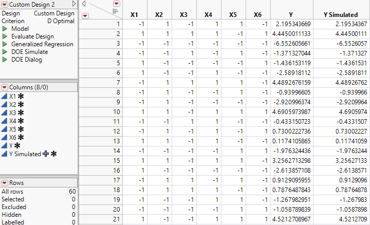 Construct the DesignNote: If you prefer to skip the steps in this section, select Help > Sample Data Library and open Design Experiment/Binomial Experiment.jmp. Click the green triangle next to the DOE Simulate script and then go to Define Simulated Responses.