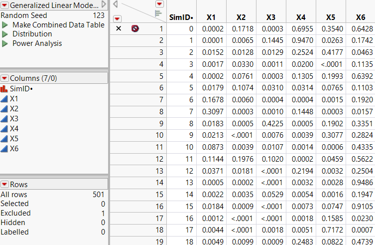 The first row of the table contains the initial values of Prob>ChiSq and is excluded. The remaining 500 rows contain simulated values.