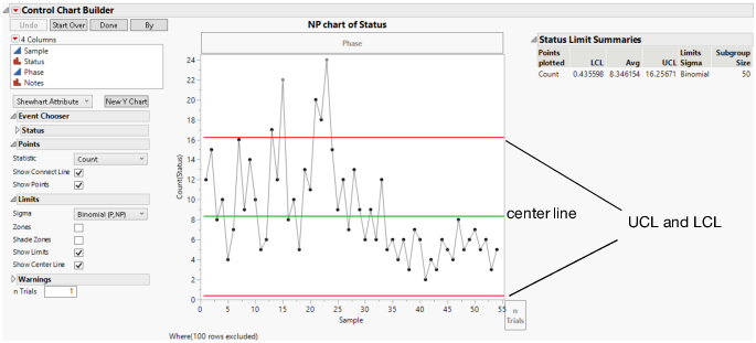 You can drag other variables into the various zones to augment the analysis and use the Control Chart Builder Options to further examine the data. Some of the right-click chart options (for example, show or hide points, limits, warnings, and zones; select statistic and sigma options) also appear on the left hand side of the chart for easy access.