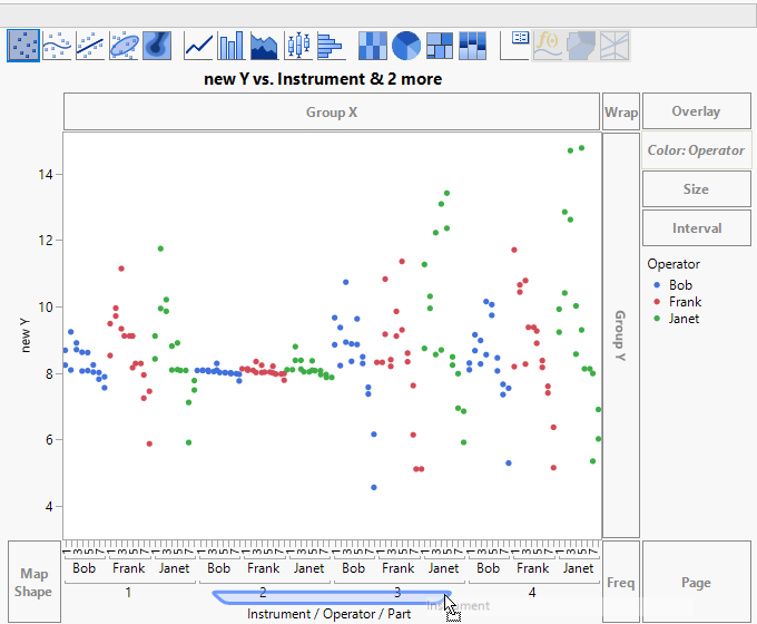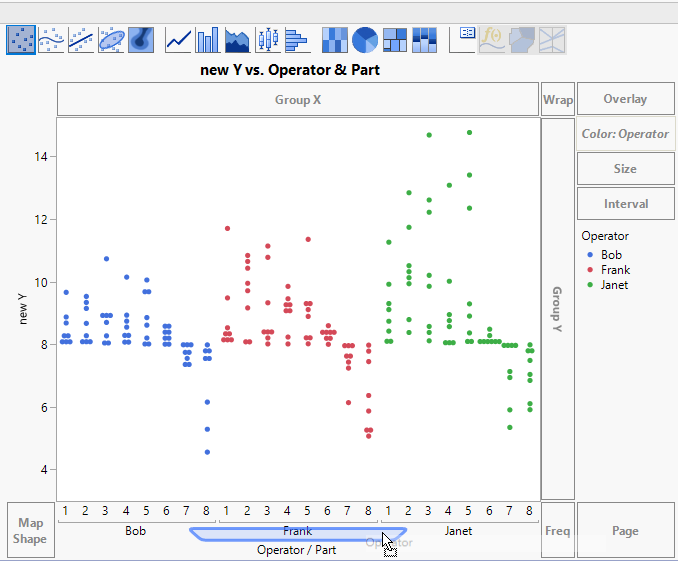 The new Y values are colored by Operator, using the legend at the right of the graph. It appears that Janet might be measuring higher values than the other two operators on most parts. But the Operator effect is not easy to visualize, so you create a separate Operator axis.