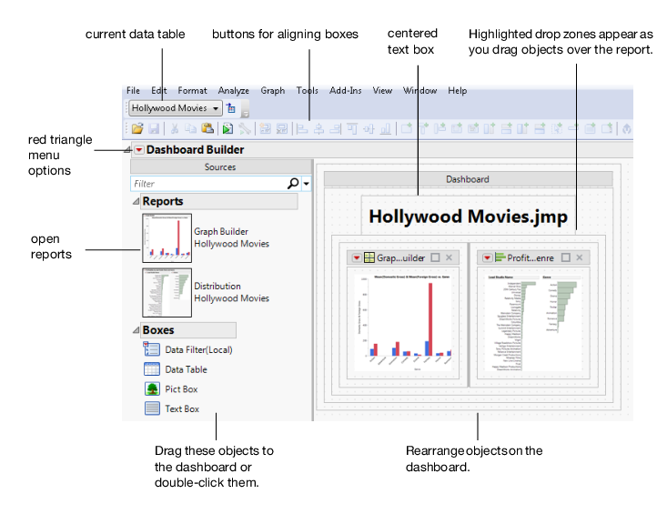 Figure 11.3 shows a dashboard in development. The two reports in the left pane were generated from the Hollywood Movies.jmp sample data table. Those reports were added to the right pane. “Hollywood Movies.jmp” is displayed in a text box that was added to the dashboard and centered using the toolbar buttons.