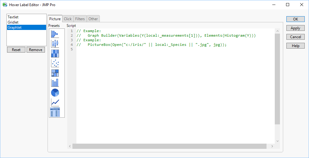 Link to a preset graph: In Graph Builder, from the underlying graph that has the preset hover label graphs, right-click > Hover Label > Hover Label Editor. Under Graphlet, in the Picture tab, copy the script. Paste the script under Click.