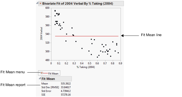 Using the Fit Mean option, you can add a horizontal line to the scatterplot that represents the mean of the Y response variable. You can start by fitting the mean and then use the mean line as a reference for other fits (such as straight lines, confidence curves, polynomial curves, and so on).