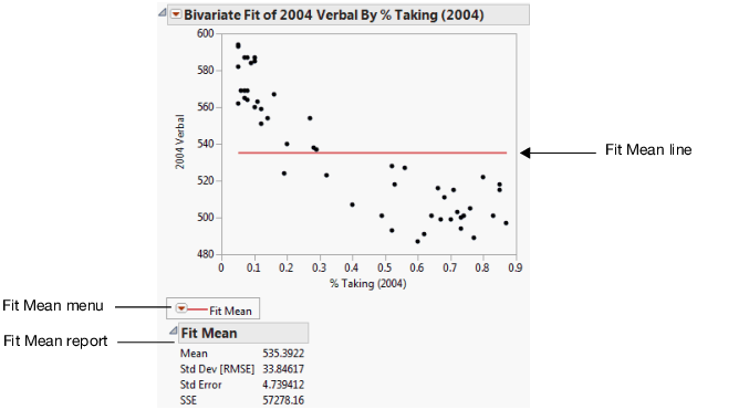 Adds a horizontal line to the scatterplot that represents the mean of the Y response variable. See Fit Mean.