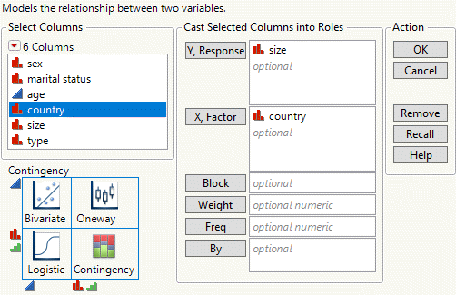 Note: You can also launch a contingency analysis from the JMP Starter window. Select View > JMP Starter > Basic > Contingency.