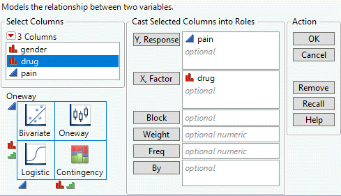 For more information about this launch window, see Introduction to Fit Y by X. For more information about the options in the Select Columns red triangle menu, see Column Filter Menu in Using JMP.